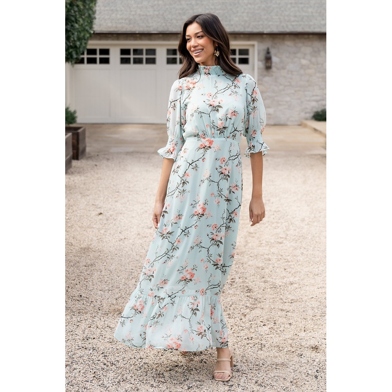 exclusive styleCute sage and rose floralFlowing chiffon materialHigh smocked necklineKeyhole and double button at back neckShort sleeves with smocked ruffle cuffsPleated detailing at front waistElastic back waistSingle tiered maxi skirtFully lined excludin