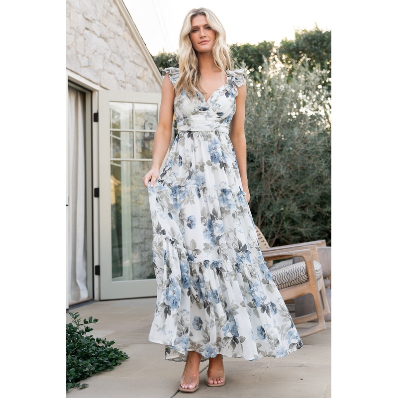 exclusive stylePerfect semi-casual dress for your wardrobePale, cool Blue background with Blue and Sage floralsMedium weight flowing chiffon materialWide V-necklineUpturned-V bodice yokeGathered bust detailSmocked back bodiceDouble layered flutter sleeveEl