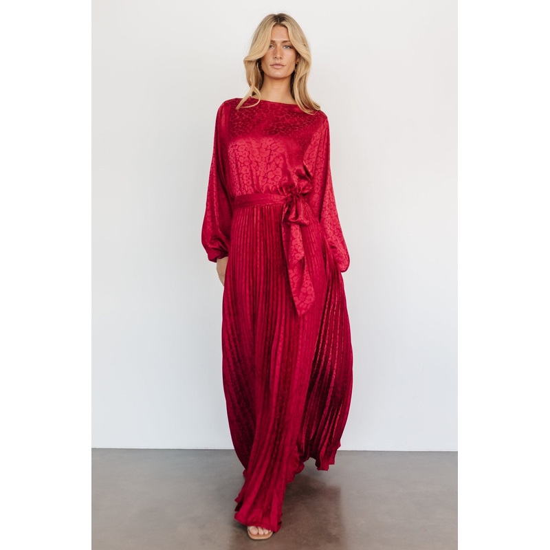exclusive style!Beautiful wine colorLovely satin-like material with flower patternRound neckline with button andkeyhole at back neckElastic at waist with adjustable waist beltLongdolman sleeveswith elastic cuffsStylish pleated maxi skirtUnlined97% Polyeste