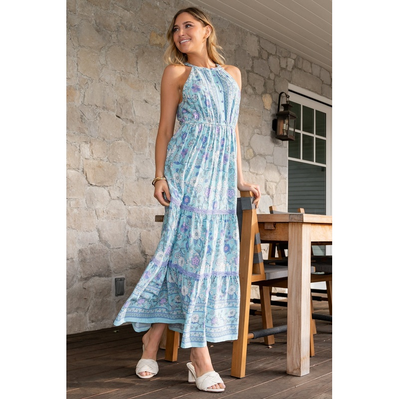 exclusivestyleBright and flowy maxi that's perfect for summer outingsAqua blue base with light purple, light green, white, and periwinkle blue floral printMaterial has no stretchHalter style with collarFunctional buttons down bodiceElastic waistbandTiered