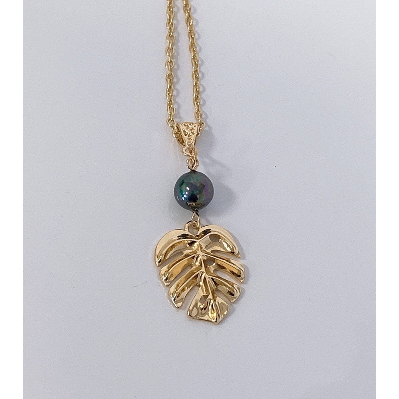 Be the first to review “Monstera Leaf : Hamilton Gold Necklace with New Black Greenish Shell Pearls”
