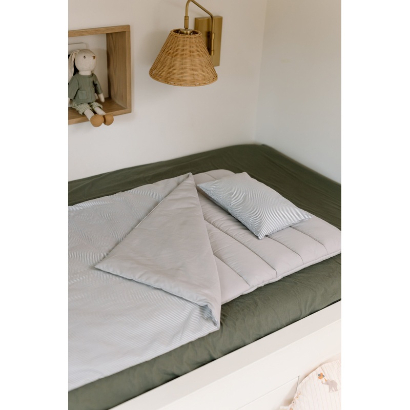 2. What are the main differences between a portable bedding set and nap mats?The main difference is that a portable bedding set is versatile and customizable. Its pad and blanket are detachable with snap buttons, allowing you to adjust the set to your liking. It also comes with a protective canvas cover bag, making it easy to store and carry with you.Our nap mats are designed for practicality, with the pad, blanket, and pillow all sewn together. They are easy to carry and fold, even for little ones.