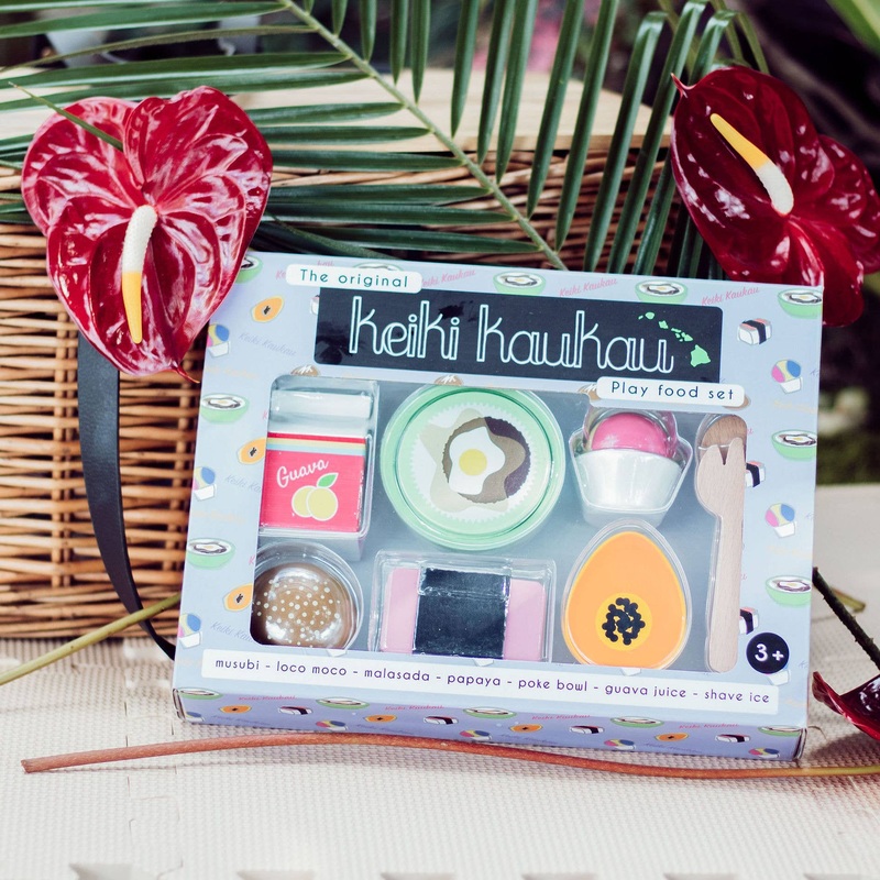 A cheerful wooden play food set representing beloved food items from Hawaii: musubi, shave ice, guava juice, papaya, loco moco, and poke bowl. For each purchase, we donate 5 meals to the Hawaii Food Bank. Ages 3+.