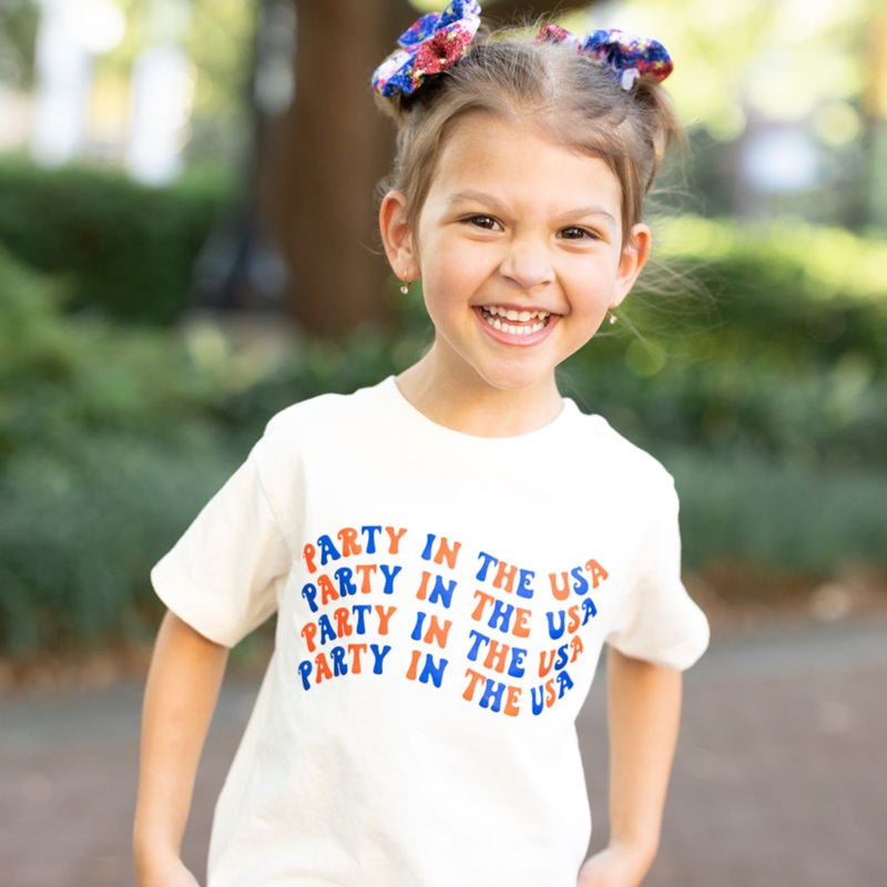 Party in the USADetailsFeatures & Sizing*Crewneck, pullover styling*Short sleeves*Print as ShownMaterials & Care*Soft Feel *100% Cotton * Heather Colors: 52% Airlume combed and ring-spun cotton, 48% poly* Athletic Heather: 90% Airlume combed and ring-spun
