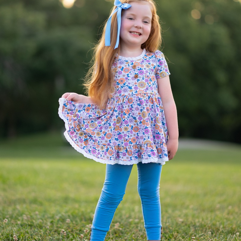 Adele sets have become a staple at ML and in our girls wardrobes.Tunic length, cotton tunic and ribbed cotton leggings. Long or short sleeves options. The floral tunic has burnt orange, purple, mustard, greens on a dark background.true to size. the legging