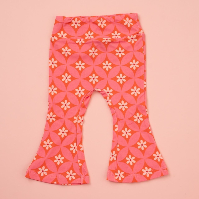 Add some vibrant retro style to her wardrobe with these fun pink and orange flower 60s girl's bell bottom leggings. Pair it with her favorite graphic tee or a cozy sweater for a cool retro look.Comfy and stretchy: Made from 95% cotton and 5% spandex for th