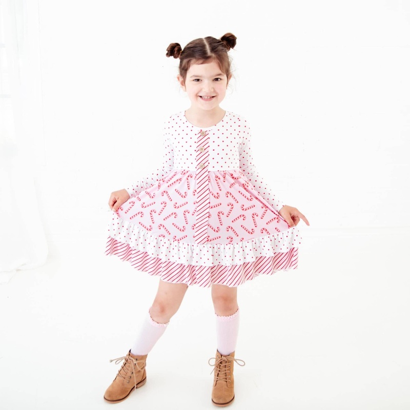 Your search for the perfect bamboo daywear piece stops right here! This adorable dress is sure to impress with long sleeves, accent button detail on the front, and long tiered skirt with double ruffles! The coordinating prints add a sophisticated flair. * 95% Viscose from Bamboo, 5% Spandex * Our Fabric is not treated with harsh chemicals * Tagless! Our daywear is free from anything itchy that might irritate your little one’s skin. * Whimsy Dress is not intended for sleepwear * Stretchy, Stylish and Comfortable! What is it about Dreamiere Bamboo? Our bamboo fabric stays about 3 degrees cooler than cotton on average. Its great for kids with eczema. It’s great for hot sleepers and sensitive skin. In warm, humid weather, our bamboo won’t stick to your childs skin. It’s sure to keep your little one drier, cooler and more comfortable year-round!
