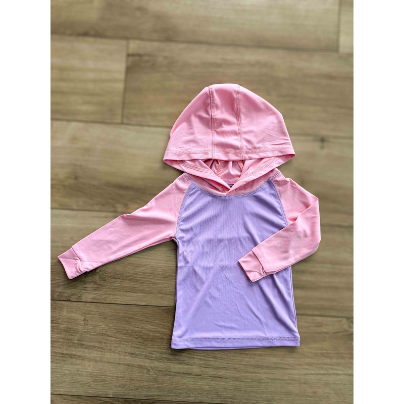 This UV resistant shirt in pink and purple color block is perfect for kids. With a quick drying feature and SPF 50+ protection, it combines fashion and function to keep your child safe from the sun. A must-have for any outdoor activities.