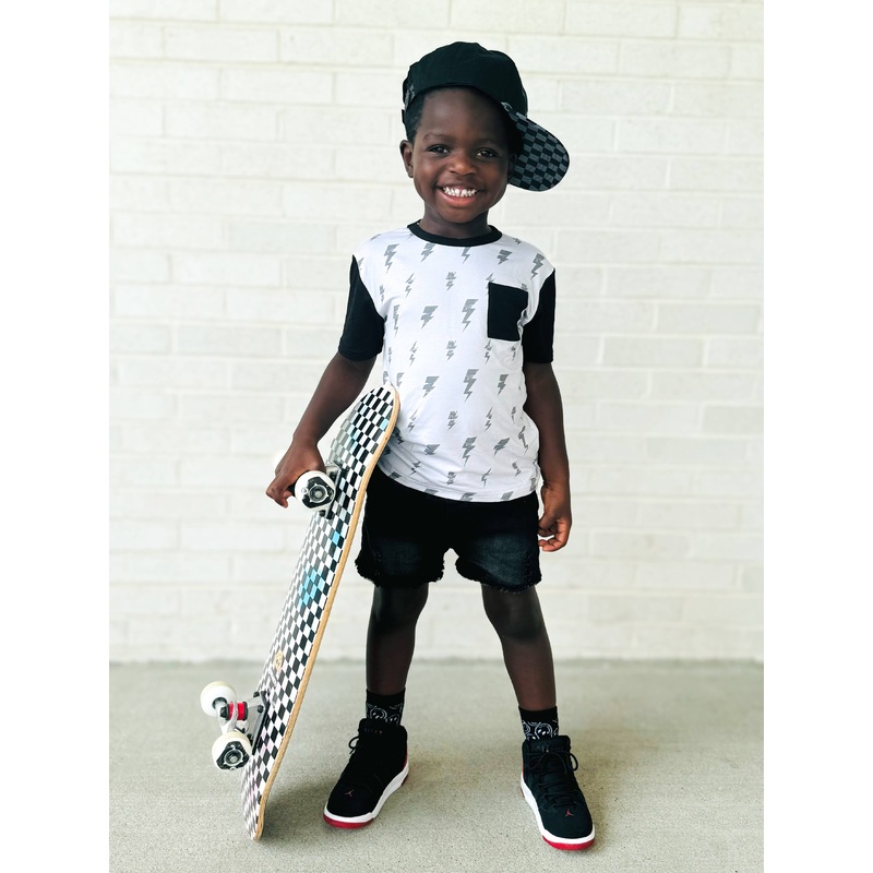 Unleash your daring style with this color block pocket tee featuring bold distressed bolts.WHY WE LOVE BAMBOO: * 3 degrees cooler than cotton. * 30% less water needed than cotton. * Naturally hypoallergenic. * Rounded bamboo fibers are less irritating to skin.