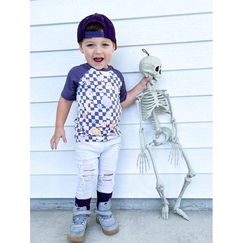 Experience the magic of the spooky season with our Creep It Real – Raglan Tee. The trendy checker print in solid purple and gray is accented with festive Halloween details for a fun and stylish look!Key Features of our Raglan Tees: * Our ultra-soft bamboo fabric is safe and gentle on eczema-prone and sensitive skin and is a great texture for those with sensory processing disorders. * Made from 220GSM bamboo fabric making them extra stretchy, yet durable for many wears. * Bamboo is naturally temperature regulating which means it will keep your little one comfortable no matter the weather. * Exclusive designs made from our very own designer!