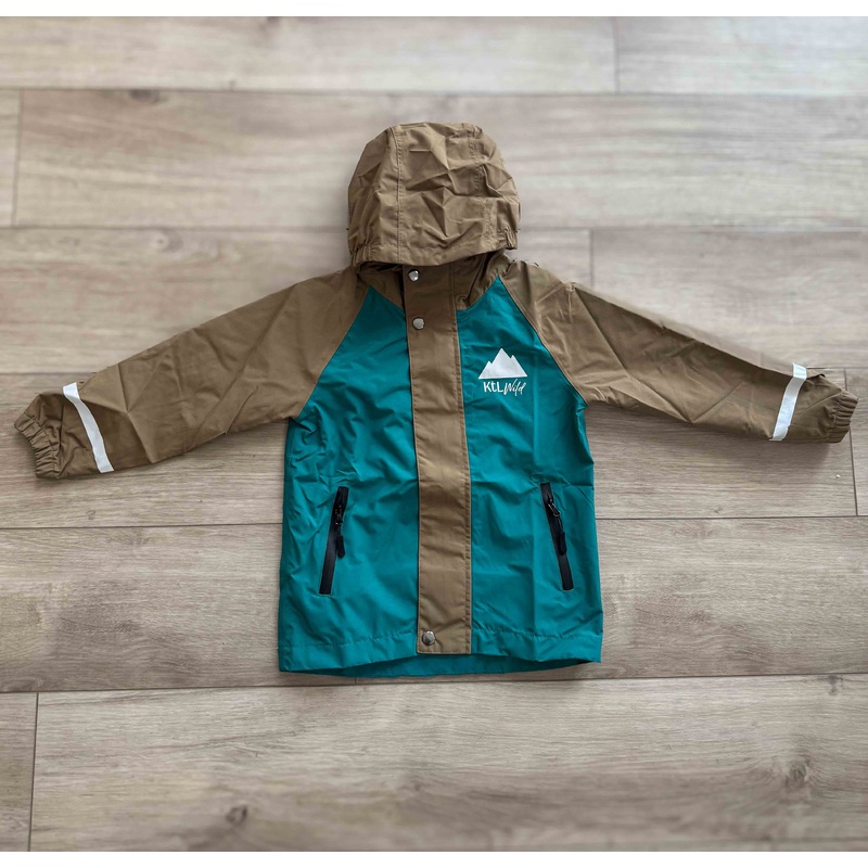 The rain jacket features a fitted hood and waterproof design, with a color block style and reflective details. This style starts at size 3-4Y, but is available in smaller sizes as a one piece suit. Stay dry all day thanks to the water column rating of 10,0
