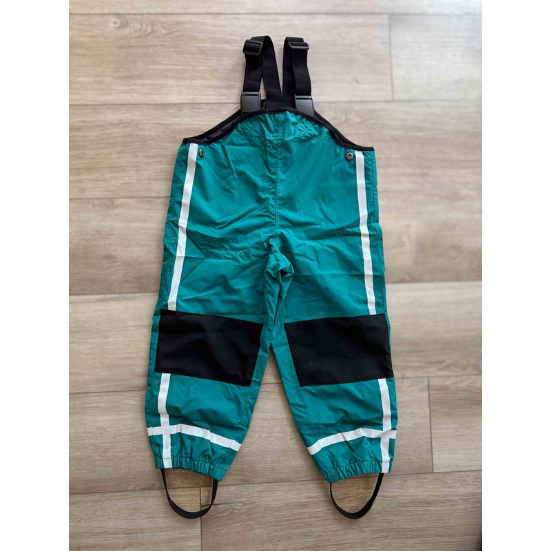 These rain pants have reinforced knees, reflective details, boot straps, and an adjustable fit. This style starts at size 3-4Y, but is available in smaller sizes as a one piece suit.