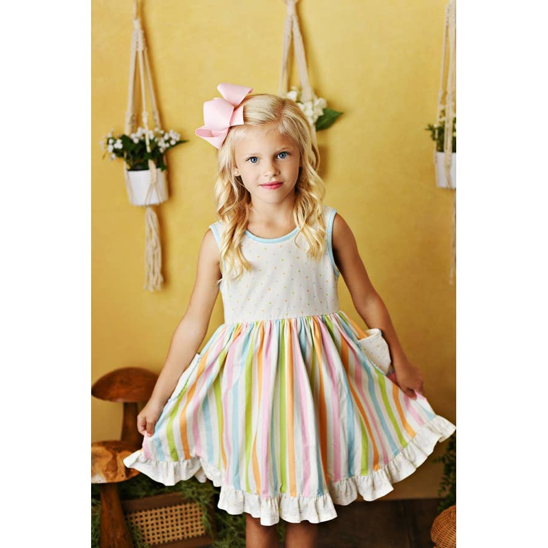 Our Rainbow Pocket Girl Dress is a whimsical delight, designed to make your little one feel extra special. This everyday dress from Swoon Baby Clothing, a beloved children's lifestyle brand, features a playful rainbow pattern that adds a splash of color to