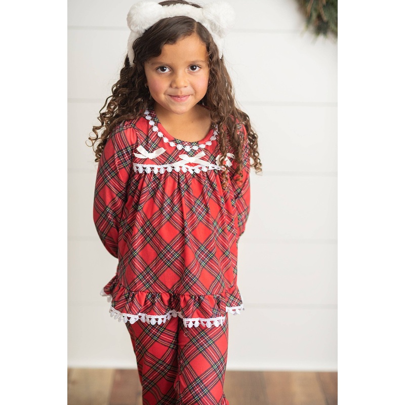 Girls two piece set includes red plaid long sleeve top with ruffles, white bows and trim accents and long pants with ruffle trim hem. Soft and comfy for lounging and playing on cozy fall winter christmas holidays.