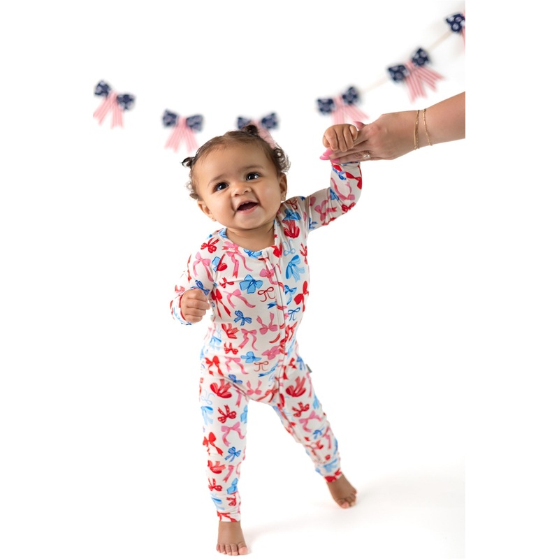 Stars, Stripes & Sweet Bows Perfect for Fireworks & Bedtime Sparkles!!Get your little one ready for cozy nights in ourPatriotic Bows jammies!Made from95% bamboo viscose and 5% spandex, these jammies are unbelievably soft, breathable, and stretchydesigned t