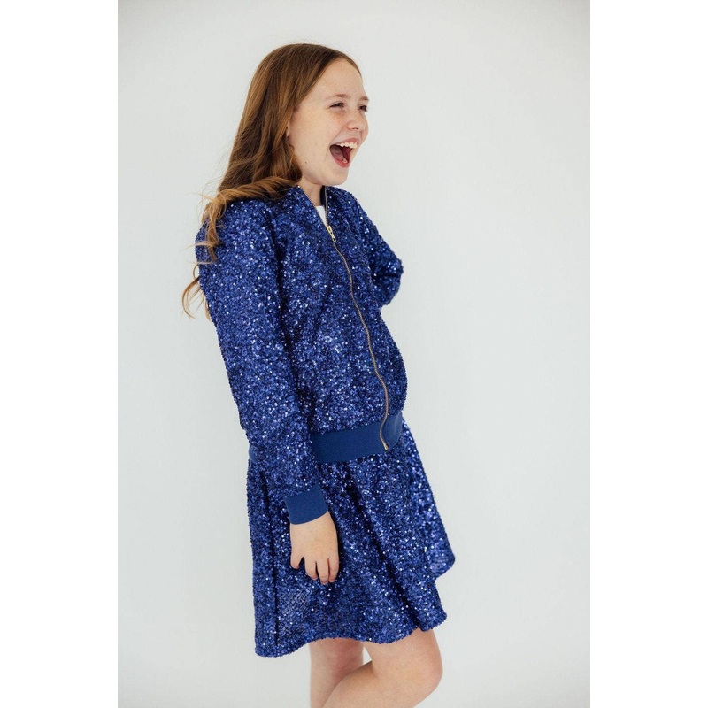 A dazzling piece that will make your little one shine like a star! Perfect for both special occasions and everyday wear. Whether she is twirling, posing for photos, or simply embracing her inner fashionista, this sequin jacket is sure to make a statement. Let her sparkle and shine with confidence and style! Also available in a matching Twirl Skort.Mix and Match our Royal Sequin collection for sisters, cousins, or BFFs.INSTRUCTIONS: Wear – Sparkle – Repeat FIT – FABRIC – CARE: * True to Size (size up if you plan to layer for chilly months) * Polyester Blend (exclusive of sequin trim) * Hand Wash Cold/Lay Flat to Dry