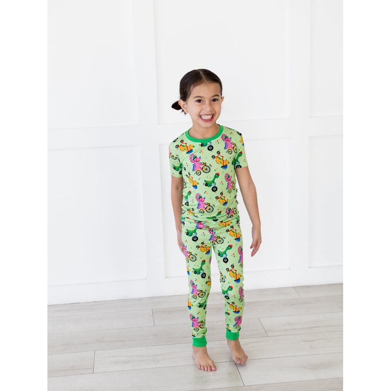 Introducing the print of dinosaurs joyfully riding bikes, our pajama set adds a playful and delightful touch to bedtime routines.Step into a world of imaginative comfort with our innovative bamboo pajama set, specially designed for babies who require tube