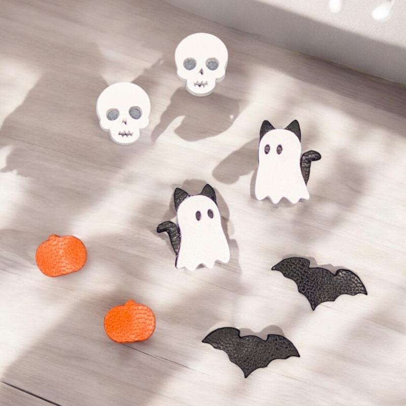 This is cutest Halloween stud pack you've ever seen! They are handmade from upcycled leather. Perfect for Halloween parties and the entire Fall season too! They are also very lightweight - each earring weighs less than .25 oz. and are .5 inches in length.