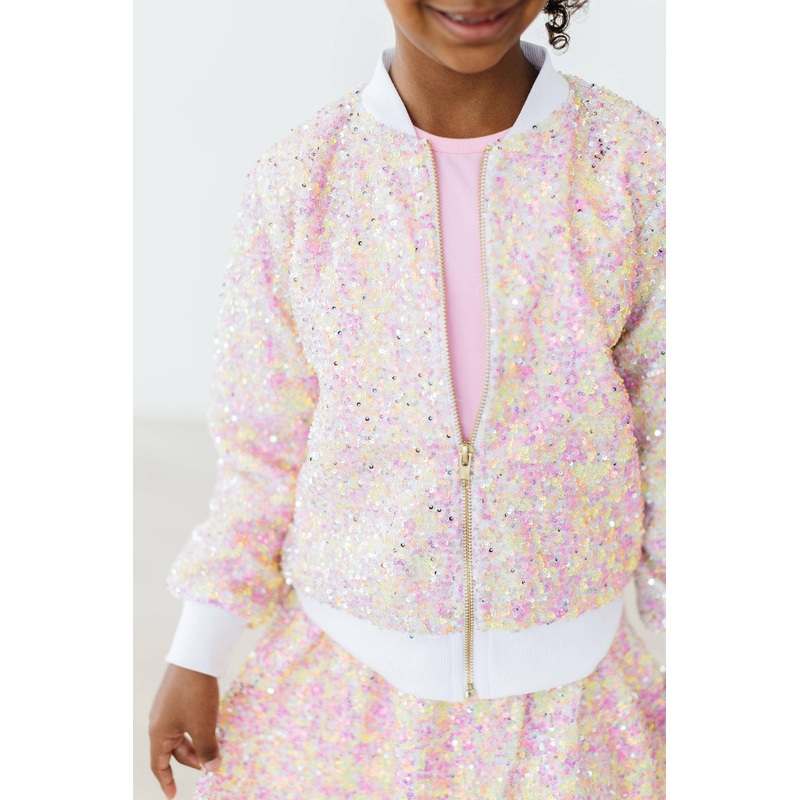 A dazzling piece that will make your little one shine like a star! Perfect for both special occasions and everyday wear. Whether she is twirling, posing for photos, or simply embracing her inner fashionista, this sequin jacket is sure to make a statement. Let her sparkle and shine with confidence and style! Also available in a matching twirl skirt. INSTRUCTIONS: Wear – Sparkle – Repeat FIT – FABRIC – CARE: * True to Size (size up if you plan to layer for chilly months) * Polyester Blend (exclusive of sequin trim) * Hand Wash Cold/Lay Flat to Dry