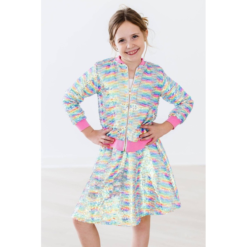 A dazzling piece that will make your little one shine like a star! Perfect for both special occasions and everyday wear. Whether she is twirling, posing for photos, or simply embracing her inner fashionista, this sequin jacket is sure to make a statement. Let her sparkle and shine with confidence and style!INSTRUCTIONS: Wear – Sparkle – Repeat FIT – FABRIC – CARE: * True to Size (size up if you plan to layer for chilly months) * Polyester Blend (exclusive of sequin trim) * Hand Wash/Lay Flat to Dry