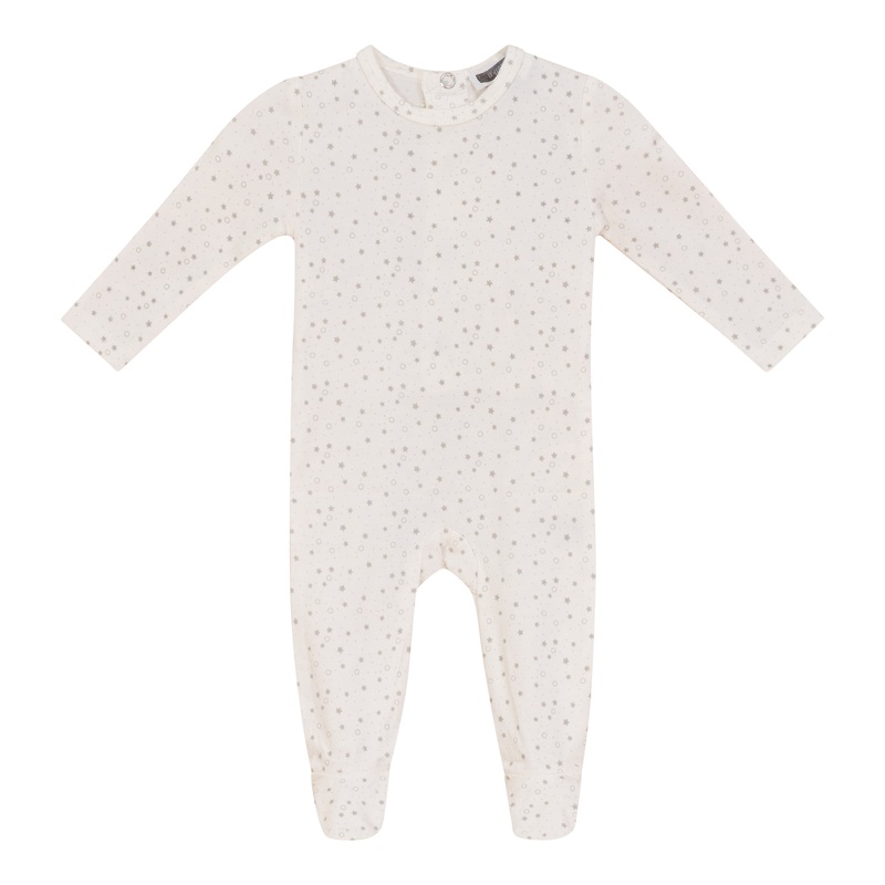 Baby boys and baby girls modal jersey allover star print onesie with center back snap opening and elastic at back ankle.