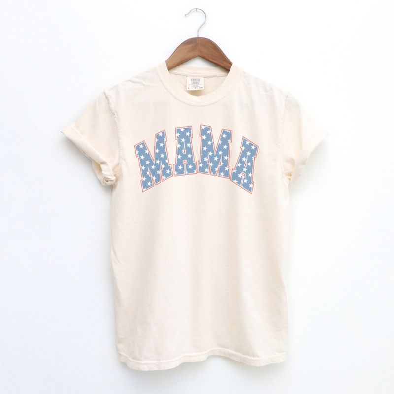Block MAMA Star Spangled TeeDetailsFeatures & Sizing*Crewneck, pullover styling*Short sleeves*Comfort Colors Brand*Ivory Shirt*Print as ShownMaterials & Care*Soft Feel *100% Cotton*Machine wash cold, dry flat*Iron inside out