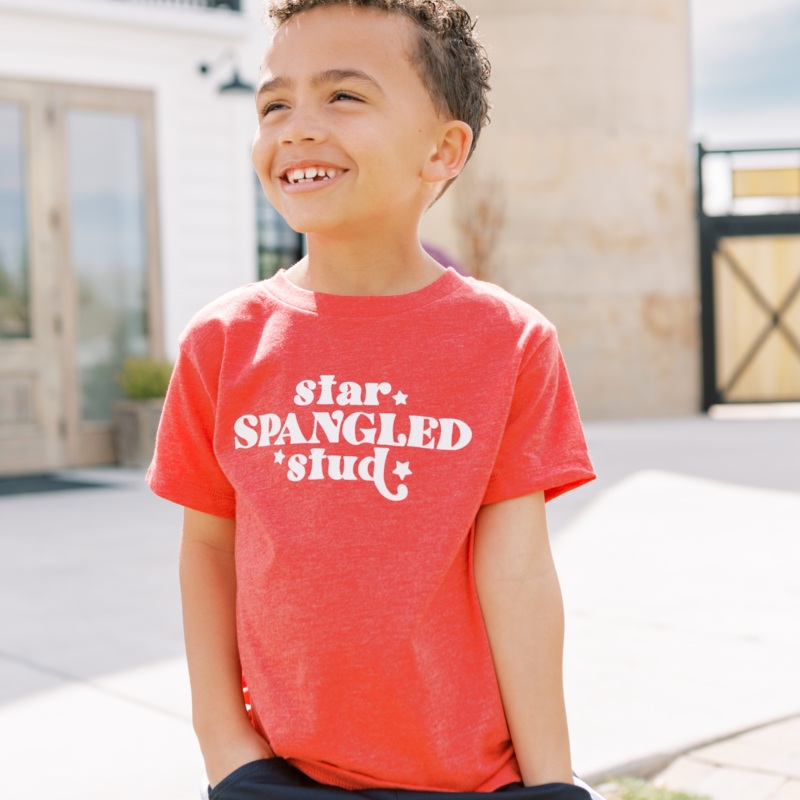 Star Spangled StudDetailsFeatures & Sizing*Crewneck, pullover styling*Short sleeves* Red, White or Blue PrintMaterials & Care*Soft Feel *100% Cotton*Heather Colors: 52% Airlume combed and ring-spun cotton, 48% poly* Athletic Heather: 90% Airlume combed and