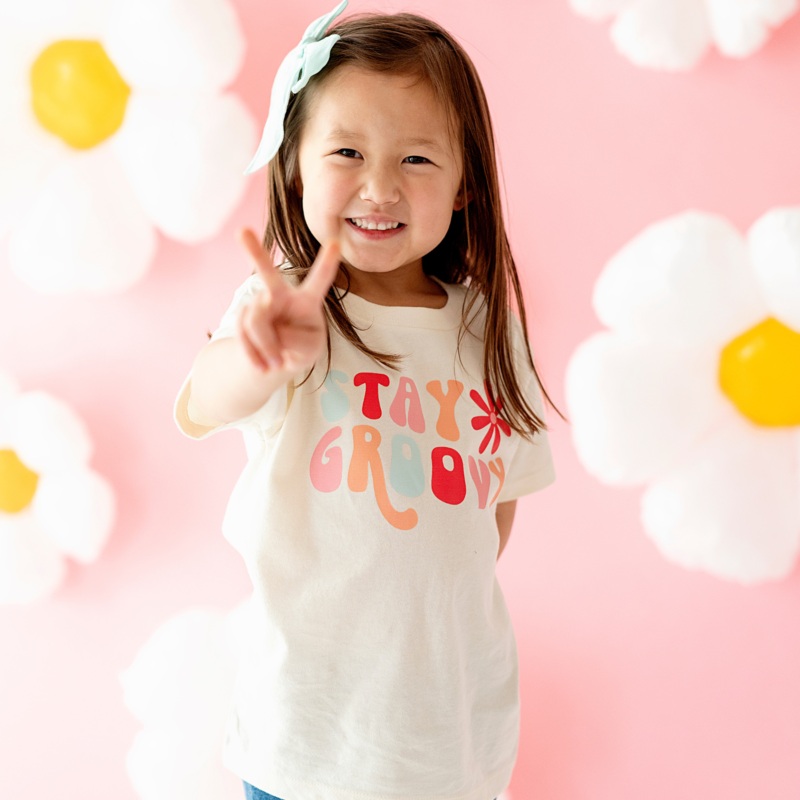 Stay GroovyFeatures & Sizing*Crewneck, pullover styling*Short sleeves*Print as shownMaterials & Care*Soft Feel *100% Cotton - Natural, White and Black, Pink*50% polyester, 25% combed & ringspun cotton, and 25% rayon - Ice Blue & Peach*Machine wash cold, dr