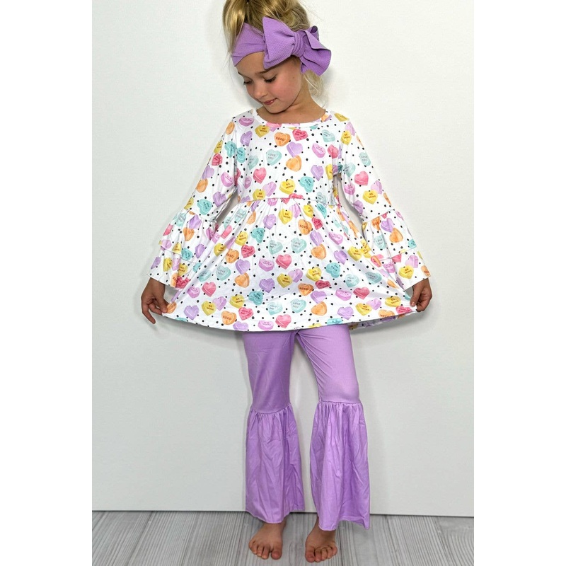 This is an adorable boutique style set with pants2ttop: 15" long & 10.5" widepants: 20" long & 9 wide hips3ttop: 16" long & 11.5" widepants: 21" long & 9.5 wide hips4ttop: 17" long & 12.5" widepants: 22" long & 10" wide hips5/6top:18" long & 13" widepants: